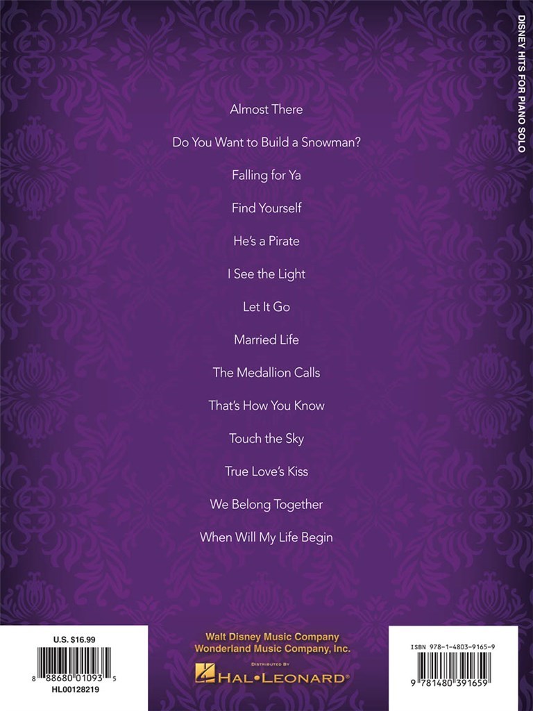 This songbook contains 14 fantastic arrangements of popular songs from contemporary Disney hit movies for Piano solo, including: Almost There, Do You Want to Build a Snowman?, Falling for Ya, He's a Pirate, I See the Light, Let It Go, Married Life, True Love's Kiss, We Belong Together and more.
