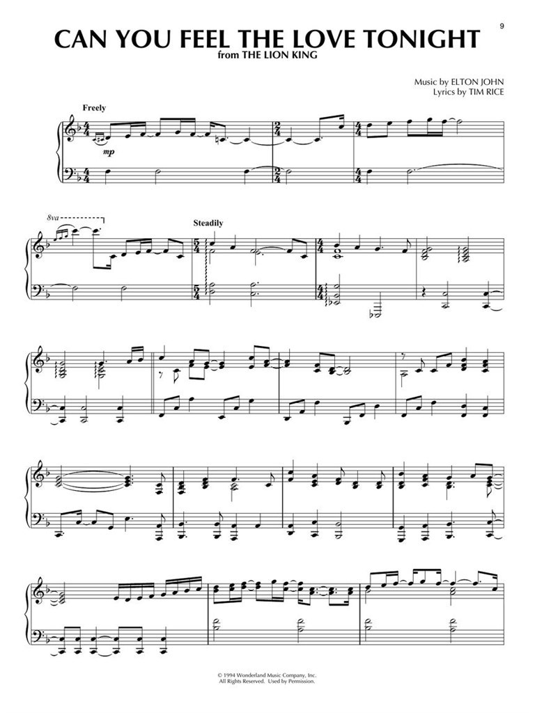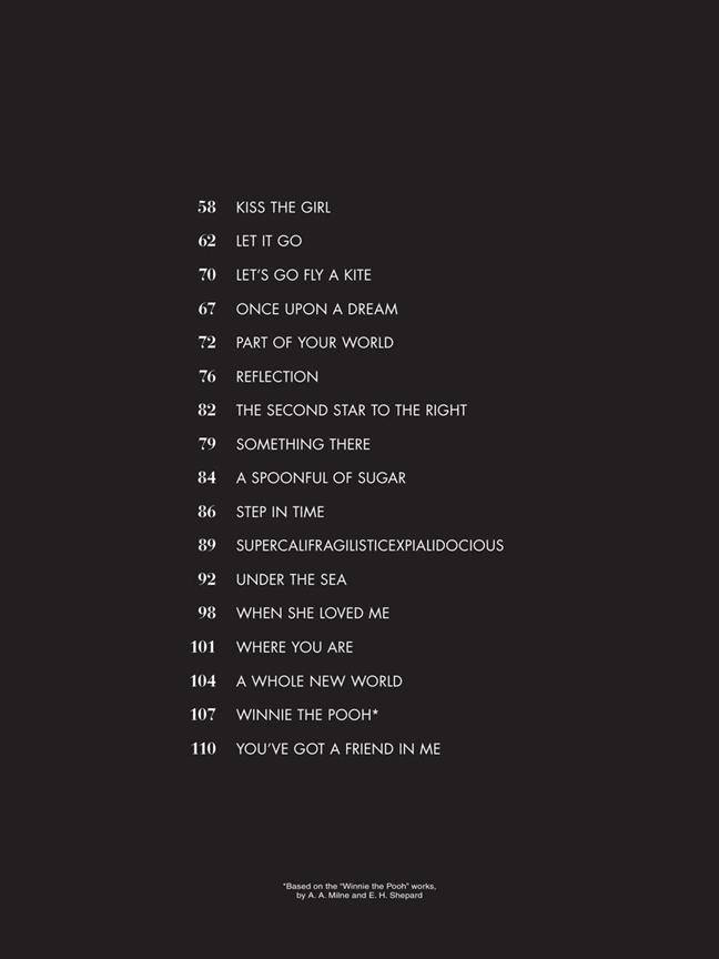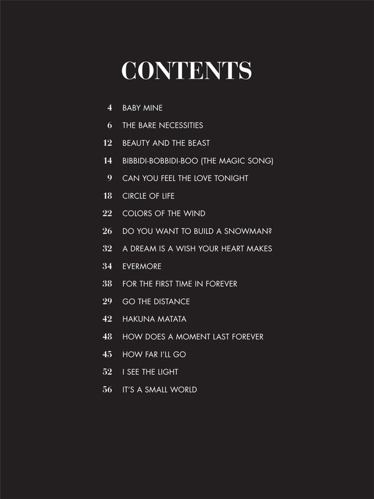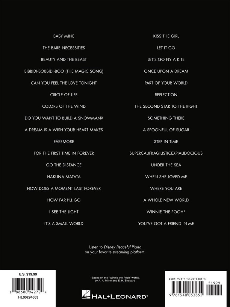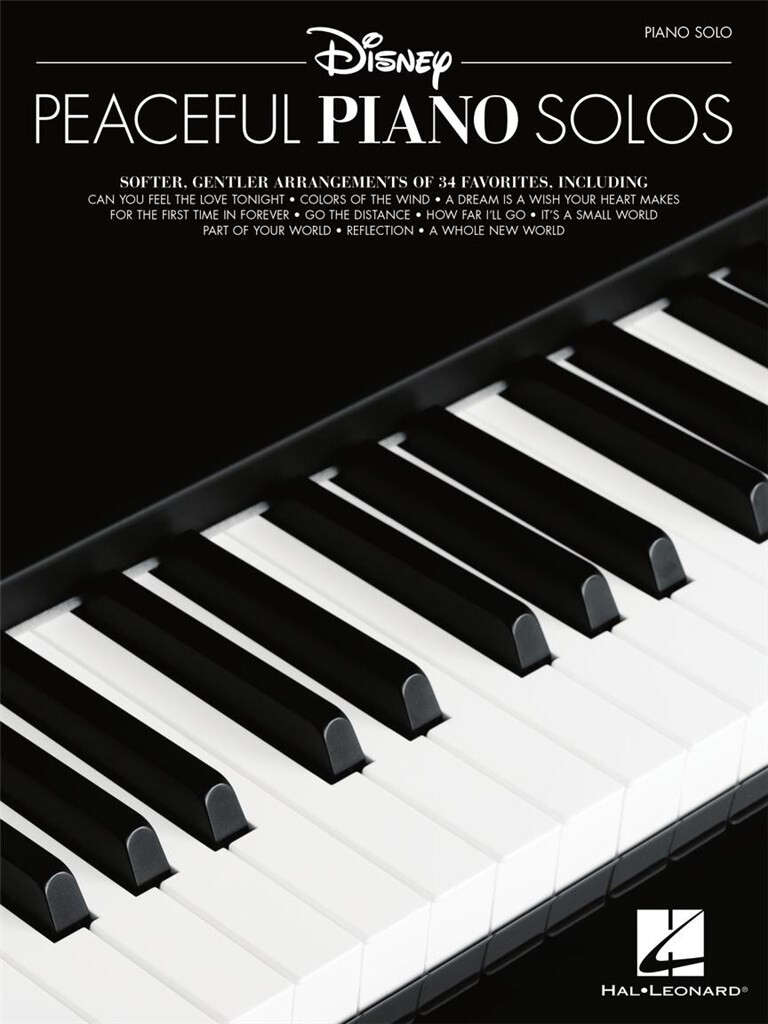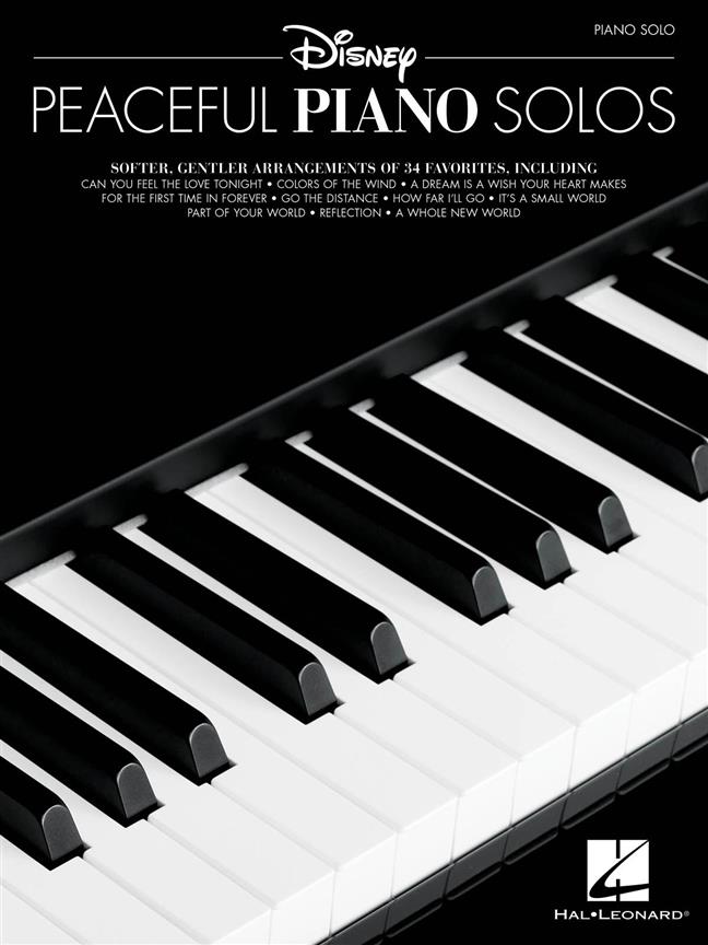 Relax at the piano with soft and gentle arrangements of 34 Disney favorites for piano as heard on their popular recordings. Songs include: Beauty and the Beast · Can You Feel the Love Tonight · Colors of the Wind · A Dream Is a Wish Your Heart Makes · For the First Time in Forever · Go the Distance · How Far I'll Go · I See the Light · It's a Small World · Let It Go · Part of Your World · Reflection · When She Loved Me · A Whole New World · and more.