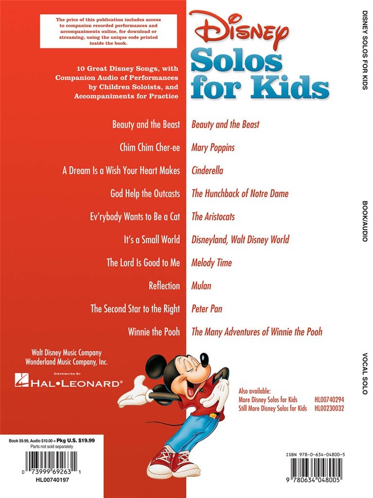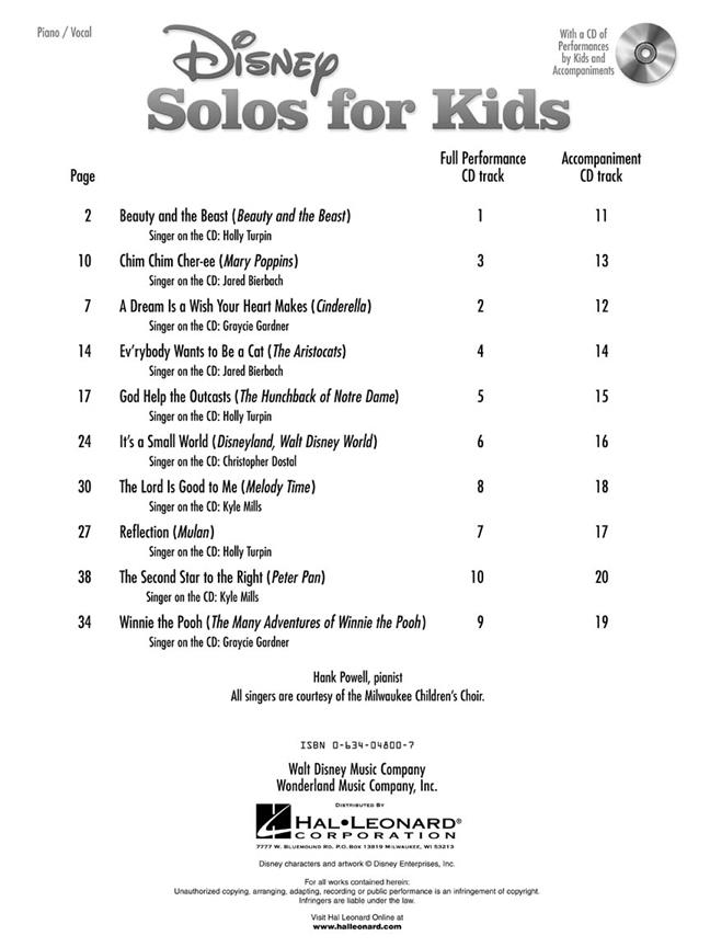 Une fantastique collection de chansons smash spécialement sélectionnés pour la voix de l'enfant. Ces dix grandes chansons des films de Disney sont organisés pour les enfants et dispose d'un CD de démonstration de compagnon. Cela abrite des représentations de chaque pièce par les solistes enfants de choeur d'enfants de la Milwaukee et aussi un accompagnement pour la pratique. Chaque chanson est définie pour voix, Piano et guitare cordes.