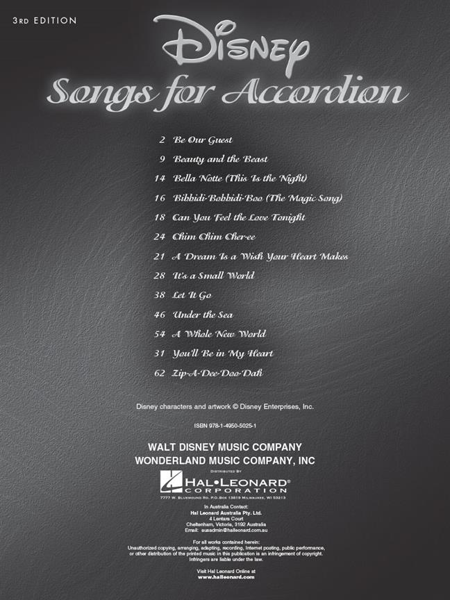 13 favoris Disney spécialement arrangés pour accordéon, notamment : Be Our Guest, La Belle et la Bête, Can You Feel the Love Tonight, Chim Chim Cher-ee, It’s a Small World, Let It Go, Under the Sea, A Whole New World, You’ll Be In My Heart, Zip-A-Dee-Doo-Dah et bien d’autres.