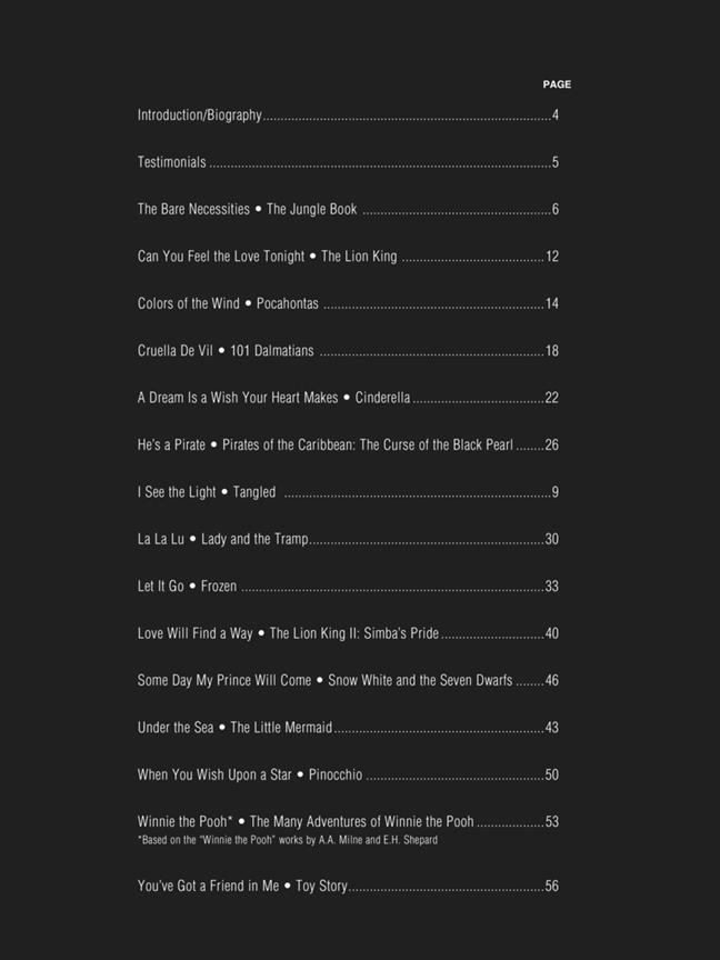 Bill Piburn a arrangé pour cette collection 15 classiques Disney en un fingerstyle accessible pour la guitare. Sont inclus : The Bare Necessities - Can You Feel the Love Tonight - Colors of the Wind - Cruella De Vil - A Dream Is a Wish Your Heart Makes - He's a Pirate - I See the Light - La La Lu - Let It Go - Love Will Find a Way - Some Day My Prince Will Come - Under the Sea - When You Wish upon a Star - Winnie the Pooh - You've Got a Friend in Me.