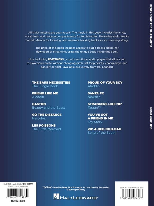 Ces nouveaux recueils dans la collection Music Minus One Vocal contenant les célèbres chansons de Disney sont maintenant disponibles pour voix d'homme et voix de femme. Ils contiennent les paroles, mélodies et accompagnements de piano des 10 plus célèbres chansons de Disney. Les démos et accompagnements sont disponibles en ligne, qui vous permettront d'interpréter ces succès comme un pro !