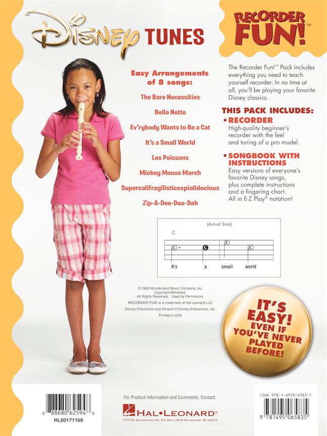 This Recorder Fun!(TM) pack makes learning to play recorder easy, even if you've never played before! In no time at all, you'll be playing your favorite Disney songs. The pack includes a high-quality beginner's recorder with the feel and tuning of a pro model, plus a songbook with easy instructions. The book features a fingering chart and easy versions of the following songs: The Bare Necessities - Bella Notte - Ev'rybody Wants to Be a Cat - It's a Small World - Les Poissons - Mickey Mouse March - Supercalifragilisticexpialidocious - Zip-A-Dee-Doo-Dah.