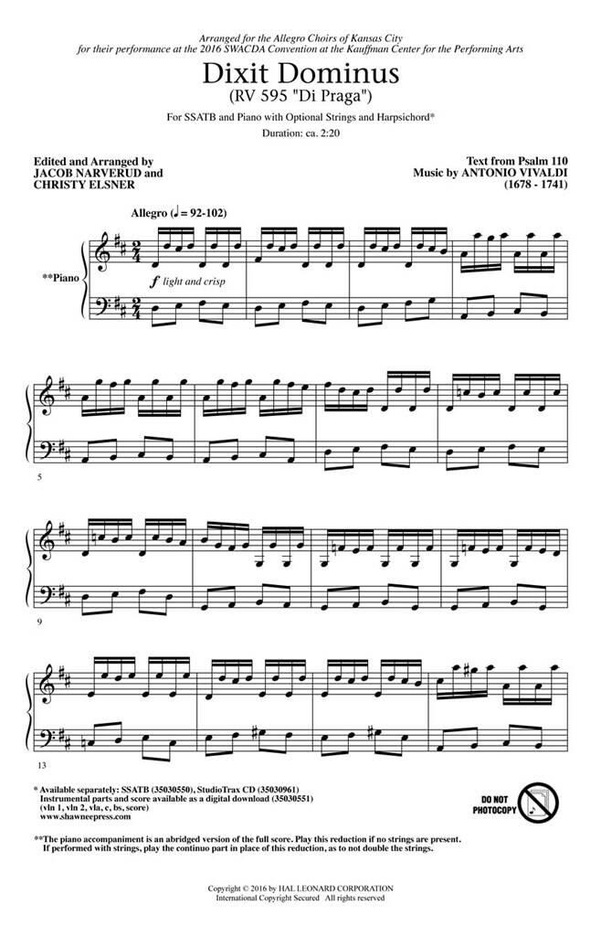 Arrangé pour les chœurs Allegro de Kansas City et mis en musique pour voix SATB, clavecin ou piano, et quatuor à cordes, Vivaldi est célébré par vos chanteurs dans cette édition élégante. Une chorale ou un ensemble d’enfants optionnel est inclus, contribuant à créer une excellente œuvre d’ouverture pour des chœurs de tous âges.