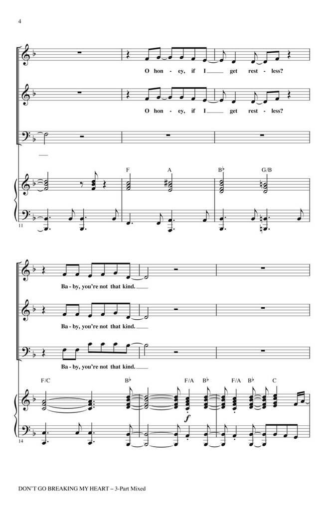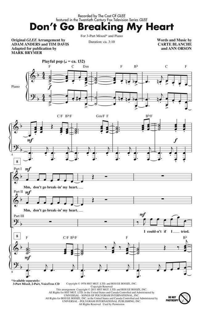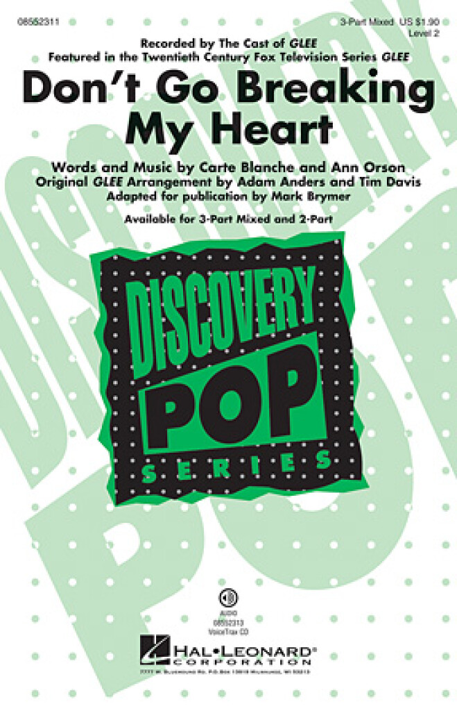 Dans le cadre du concours « Duets » sur Glee, Rachel et Finn ont répété le tube classique #1 de 1976, « Don’t Go Breaking My Heart » d’Elton John et Kiki Dee. Absolument adorable et un choix parfait pour des ensembles de tous âges ! Disponible séparément : mixé en 3 parties, en 2 parties, VoiceTrax CD. Durée : environ 3:10. Niveau de découverte 2.