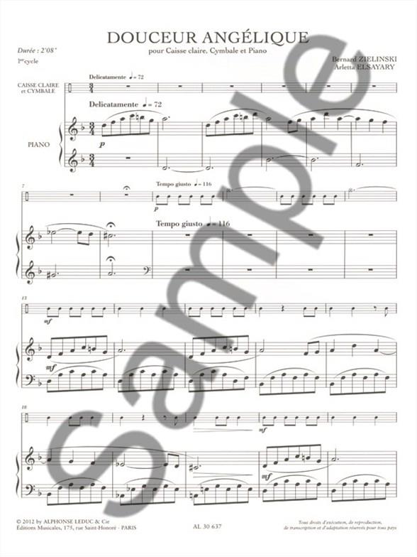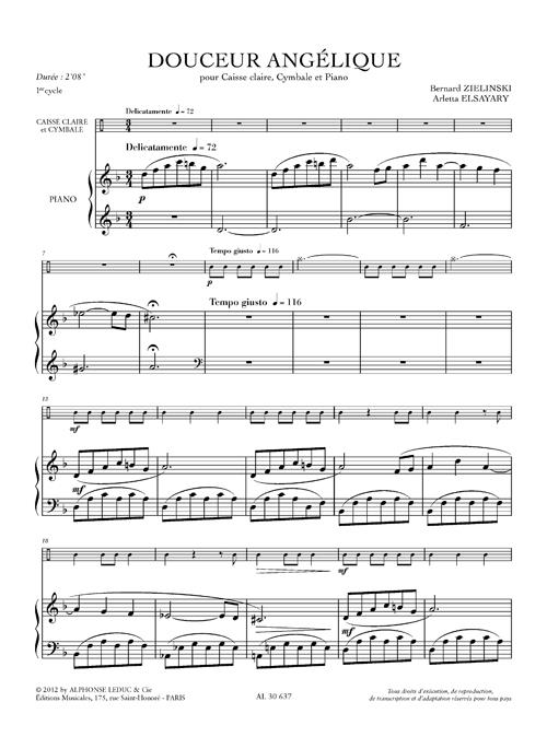 Nouvellement sortie en janvier 2013, cette partition Douceur Angélique pour Percussions est éditée par les éditions Leduc et possède AL30637 comme référence.