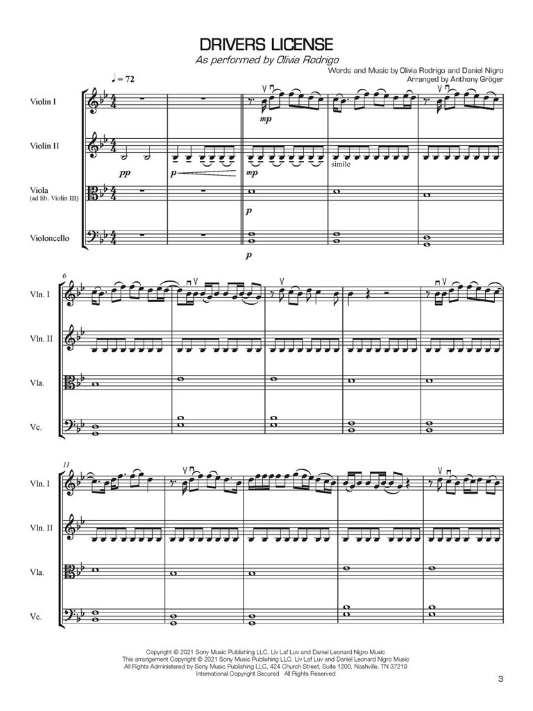Drivers License is the debut single by the young American singer Olivia Rodrigo. The song, a power ballad inspired by heartbreak, received critical acclaim upon its release, with reviewers lauding Rodrigos song writing skills and singing voice. Arranger Anthony Gröger did not fail to notice this mega hit, taking the beautiful ballad and creating an intense and passionate arrangement for string quartet.