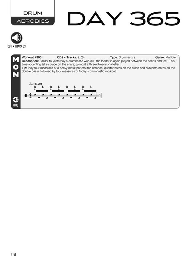 Un programme d'entraînement de 52 semaines, un exercice-par jour pour le développement, amélioration et le maintien du tambour technique. Les joueurs de tous les niveaux - débutant à avancé - augmentera leur vitesse, la coordination, la dextérité et la précision.L'accompagnement des CD audio comprennent tous les 365 d'entraînement licks plus jouer le long des rainures dans tous les styles.