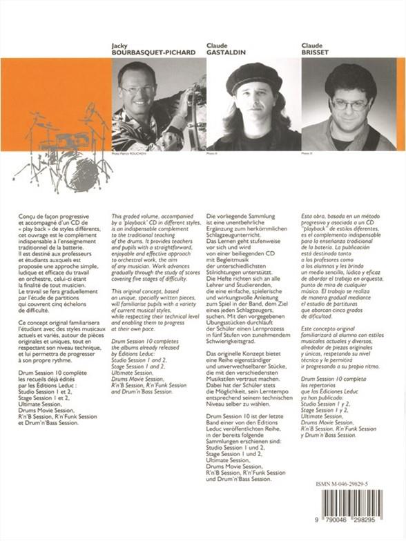 Drum Session 10 is set of 25 pieces for mixed-level drummers by Jacky Bourbasquet and Claude Gastaldin, with the music written by Lionel Melot. It contains a mix of progressive solos to enable the drummer to play a variety of styles via pieces of increasing difficulty. Drum Session 10 comes with a CD, which will help the player to get the right tempo while playing. The co-writers, Jacky Bourbasquet and Claude Gastaldin are professional drummers and/or professors who believe in progressive methods to be able to gain in skills and technique.