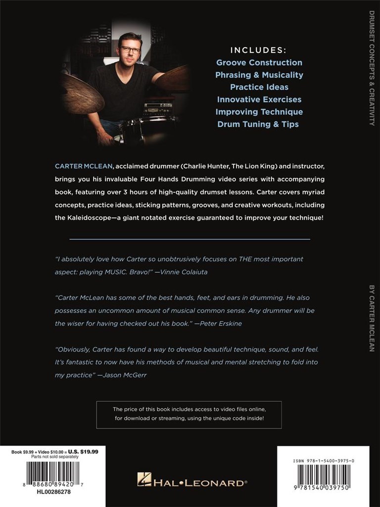Acclaimed drummer and instructor Carter McLean brings you his invaluable Four Hands Drumming video series with accompanying book, featuring over 3 hours of high-quality drumset lessons. Carter covers myriad concepts, practice ideas, sticking patterns, grooves, and creative workouts, including the Kaleidoscope - a giant notated exercise guaranteed to improve your technique! Topics covered include: groove construction, phrasing and musicality, practice ideas, innovative exercises, improving technique, drum tuning and tips and more.