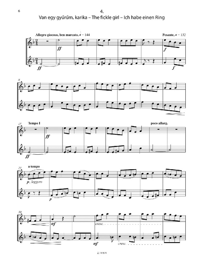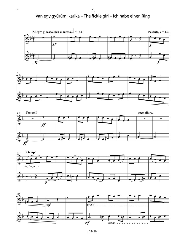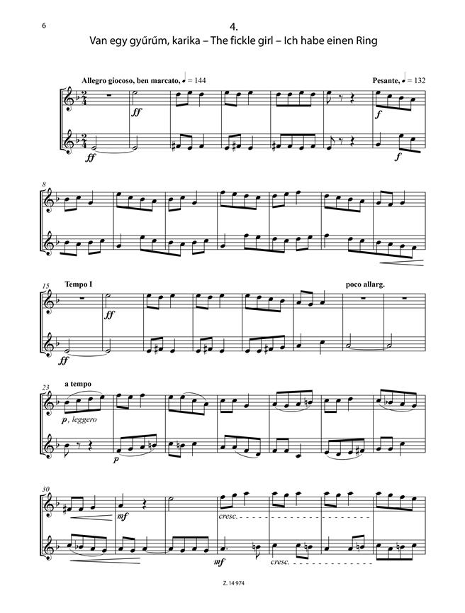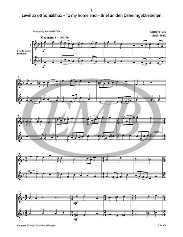 The Children's and Female Choruses were composed in a single burst of creative activity at the zenith of Bartók's career, in the summer of 1935, between such masterpieces as the String Quartet #5 and the Music for Strings, Percussion and Celesta. These short choral pieces are based on folk texts that Bartók further polished and stylized. The music, however, is wholly the composer's own, although it frequently includes motifs, rhythmic formulas and line structures reminiscent of Hungarian folk songs. Both editions contain nine of the two-part pieces of the set, transcribed idiomatically but faithfully for descant and treble recorders, respectively.