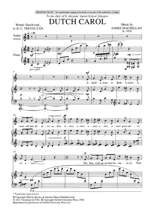 MacMillan's setting of text by R. C. Trevelyan using a traditional dutch carol. This is a simple piece for unison choir which is given a colourful piano part to enhance its sense of progress. Easy for children to pick up and attractive to listen to.