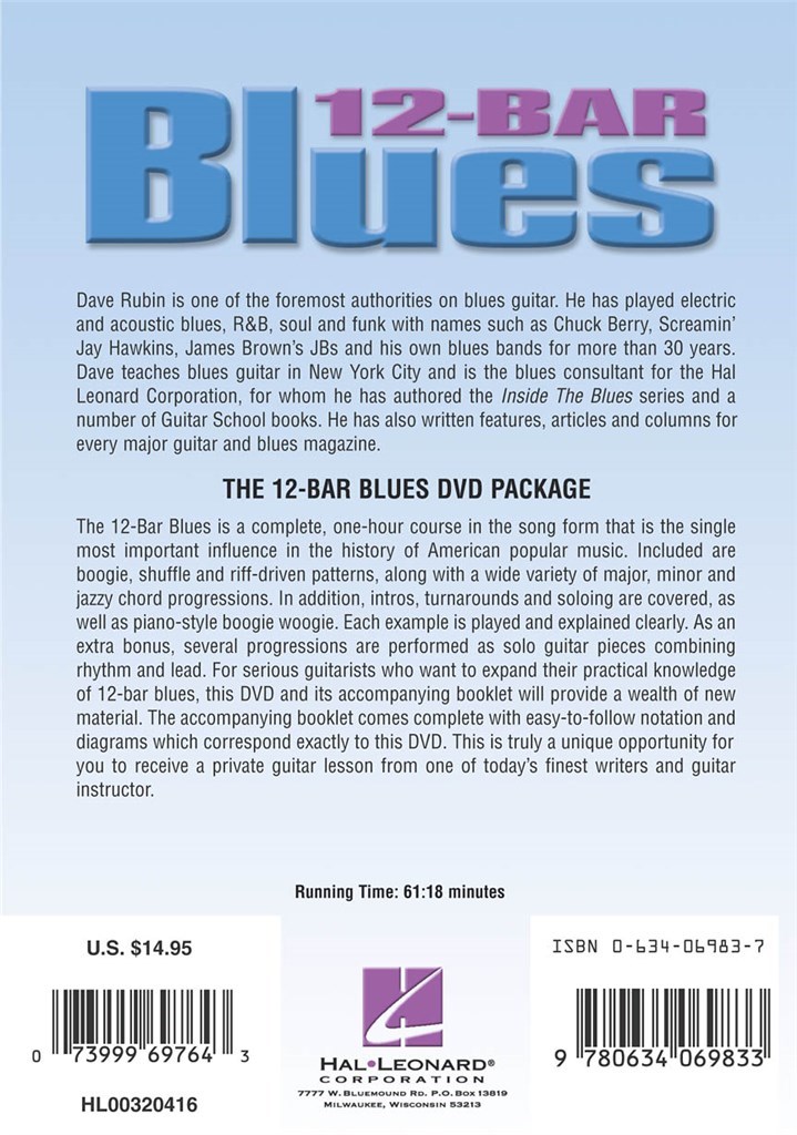 Ce DVD est un cours complet, une heure sous la forme de la chanson qui est la seule influence plus importante dans l'histoire de la musique populaire américaine. Autorité de blues Dave Rubin enseigne en boogie de détail, shuffle et axée sur le riff de patrons, avec une grande variété de progressions d'accords majeurs, mineurs et jazzy. En outre, intros, revirements et isolation sont couverts, ainsi que piano-style boogie woogie. Chaque exemple est joué et a expliqué clairement. Un bonus supplémentaire, plusieurs des progressions sont effectuées que des morceaux de guitare solo combinant le rythme et le plomb. Pour les guitaristes graves qui veulent élargir leurs connaissances pratiques de 12-bar blues, ce DVD et son livret accompagnant fournira une richesse de nouveau matériel.