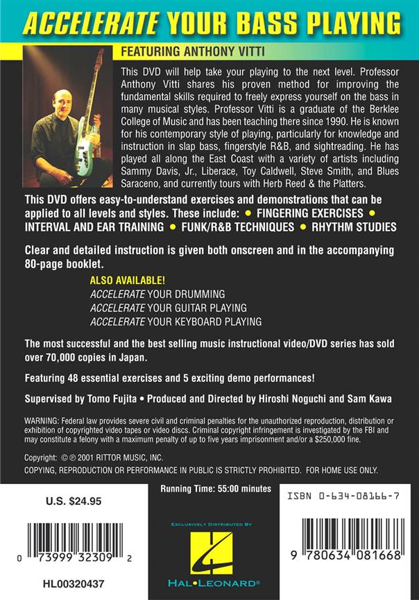 Un facile à suivre des DVD de prendre votre basse jouant à un niveau supérieur ! Des instructions claires et détaillées, tous deux à l'écran et dans le livret de 80 pages accompagnant créent une expérience d'apprentissage étonnante qui ne manquera pas. Méthode éprouvée du expérimentés musicien et tuteur professeur Anthony Vitti permettra d'améliorer les compétences de fundamnetal qui sont nécessaires pour vous exprimer librement sur la guitare basse dans de nombreux styles musicaux. Les exercices et les manifestations sont intéressants et intuitive, mais sont toujours faciles à comprendre et peut être appliquée à tous les niveaux de capacité et de styles. Les sujets abordés comprennent : des exercices de doigté, intervalle et oreille de formation, les techniques de Funk/RandB études de rythme.