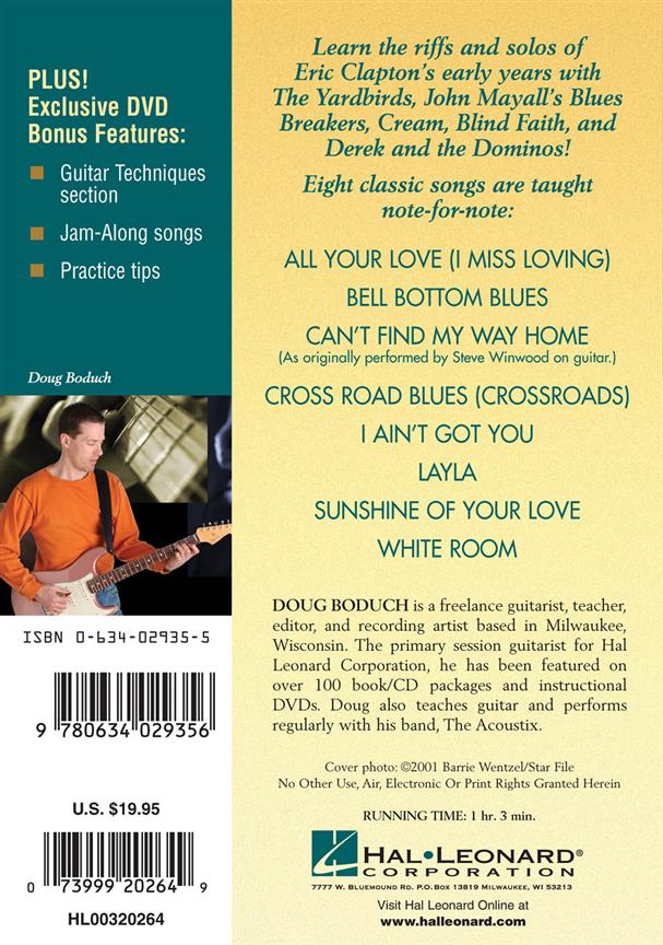 Eric Clapton est un des guitaristes de plus acclamés et bien connu du monde. Son style a influencé et inspiré d'innombrables autres musiciens et sa technique incroyable lui a valu le nom de " Main lente ". Maintenant dans ce fabuleux DVD de la série de Licks guitare Signature, vous pouvez apprendre le licks, riffs et solos qui a propulsé lui et ses bandes en ascension. Les frais de scolarité caractéristiques des premières années de chansons de huit classiques de temps de Clapton avec les Yardbirds, John Mayall s Blues Breakers, crème, foi aveugle et Derek and the Dominos. Les bonus du DVD incluent la section Technique de guitare, de Jam-le long de chansons et de conseils pratiques.