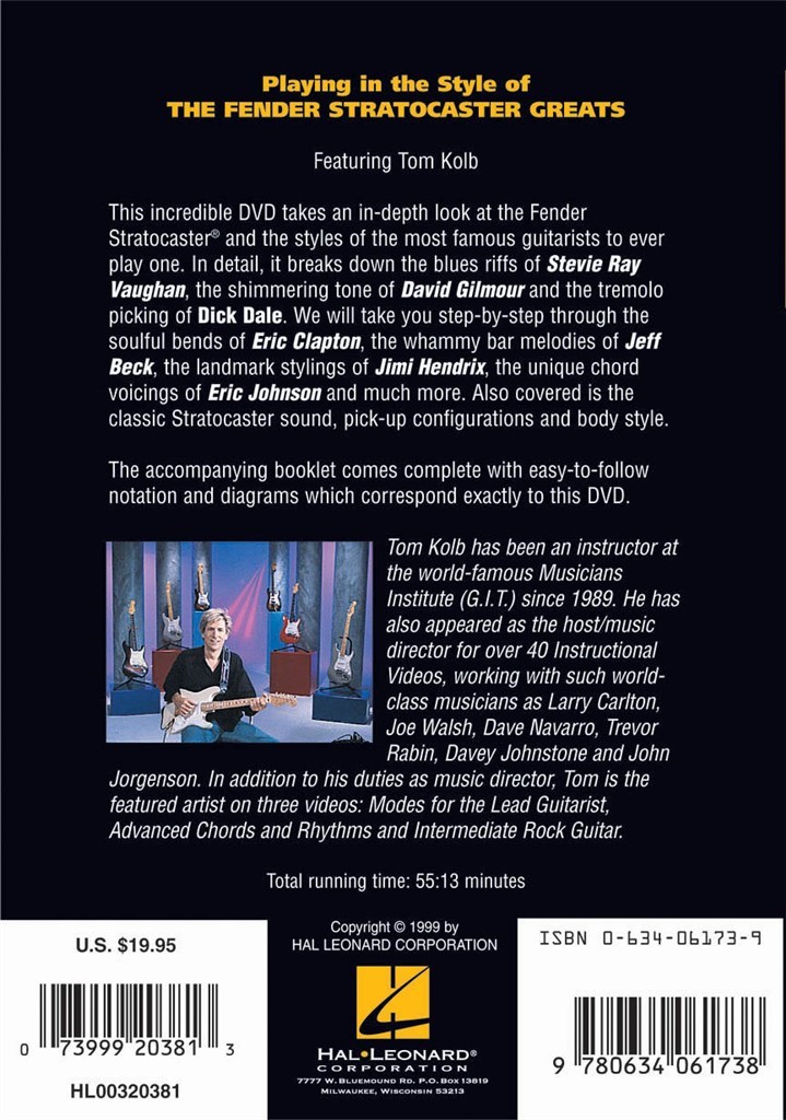 Ce DVD incroyable prend une analyse approfondie du Fender Stratocaster et les styles du plus célèbre guitariste à jouer un. Dans le détail, il se décompose les riffs de blues de Stevie Ray Vaughan, le ton chatoyante de cueillette de trémolo Daivd Gilmour et th de Dick Dale. Nous prendrons vous guidera étape bends soulful d'Eric Clapton, les mélodies de barre whammy de Jeff Beck, le style de point de repère de Jimmy Hendrix, les voicings corde unique de Eric Johnson et mucho plus. Egalement couverts est une classique Stratocaster sonores, des configurations de pick-up et style body. La brochure d'accompagnement est livré avec la notation facile à suivre et des diagrammes qui correspondent exactement à ce DVD. Tom Kolb a été instructeur dans le monde célèbre Institut de musiciens depuis 1989. Il est également apparu comme directeur de l'hôte/musique pour plus de 40 vidéos, en collaboration avec des musiciens de renommée mondiale comme Larry Carlton, Joe Walsh, Dave Navarro, Trevor Rabin, Davey Johnstone et John Jorgenson.