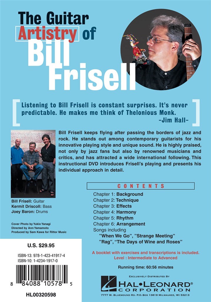 Ce DVD d'instruction présente le jeu de Frisell et son approche individuelle en détail. Inclus en outre les chansons When We Go, Strange Meeting, Rag, et The Days of Wine and Roses. Conçu pour un niveau intermédiaire à un niveau avançé, ce DVD inclut également un livret avec des exercices et des transcriptions. Durée : 61 minutes.