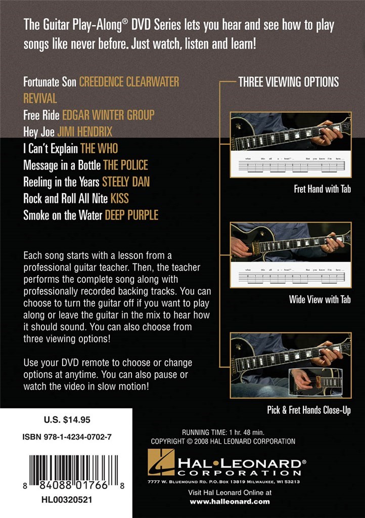 Cet enregistrement vous permettra d'écouter et de voir jouer 8 célebres chansons. Chaque chanson commence par une explication donnée par un professeur de guitare. Puis ce professeur joue le morceaux entierement accompagné de 'backing tracks', les tablatures s'affichent en bas de l'écran.