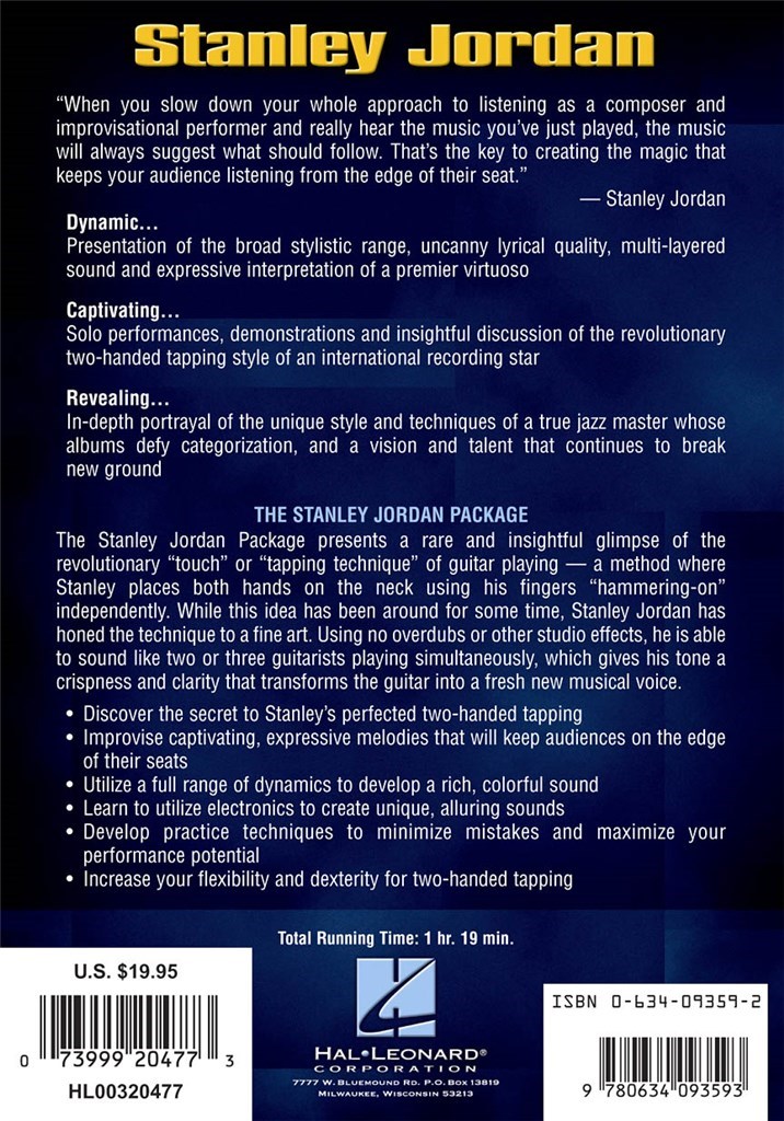 Un examen spécial plan rapproché des techniques uniques virtuoses du maestro de guitare Stanley Jordan. Sons de guitare multicouche de Jordan ont créé des albums qui défient les conventions et catagorisations. Il a pris la technique du tapping à deux mains et mis au point une méthode de jouer qui pousse la technique à la limite, donnant l'impression de deux ou trois guitares simultanées. Ce style de jeu permet de Jordanie effectuer autrement impossible lignes mélodiques. ententes et accords qui englobent à la fois de la gamme complète de l'idéogramme. La technique a donné Jordan, une voix unique de Jazz et un son indéniable qui est captivante et excitante pour être témoin. Ce DVD couvre tous les aspects de sa technique d'écoutes et comment développer l'idée en pleine improvisations et solos, y compris : Aspects de la mélodie et de la gamme étendue offrent par cette technique dynamique et créant des tons riches et expressives guitare électronique de l'utiliser pour créer la séduisante et inusitée sons des méthodes pratiques pour...