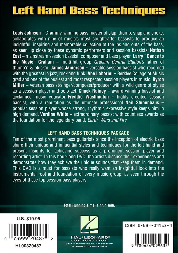10 joueurs de basse plus influents d'aujourd'hui se réunissent sur ce DVD: James Jamerson Jr. Louis Johnson Abe Laboriel Nathan East Chuck Rainey Freddie Washington Verdine blanc Larry Graham Byron Miller Neil Stubenaus. Ce DVD se penche sur la technique de la main gauche se concentrant sur l'idéogramme. Tous les 10 artistes révèlent leur propre approche unique à écailles, Arpèges, accords, utilisation de chaîne ouverte et adaptation des lignes de basse à une variété de styles musicaux y compris funk, rock, blues, Motown et beaucoup d'autres.