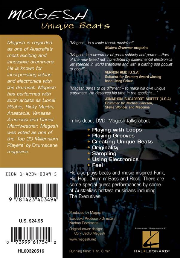 Magesh est considéré comme l'un des batteurs plus excitantes et novateurs d'Australie, connus pour l'intégration de tablas et live electronics avec le surdos. Ce DVD fournit un examen détaillé du style Magesh distinctif, avec battements et musique inspirée de funk, Drum'n' basse et le Hip Hop, y compris les discussions de : jouant avec des boucles de rainures de jouer la création unique beats électroniques originalité à l'aide de l'échantillonnage se sentent