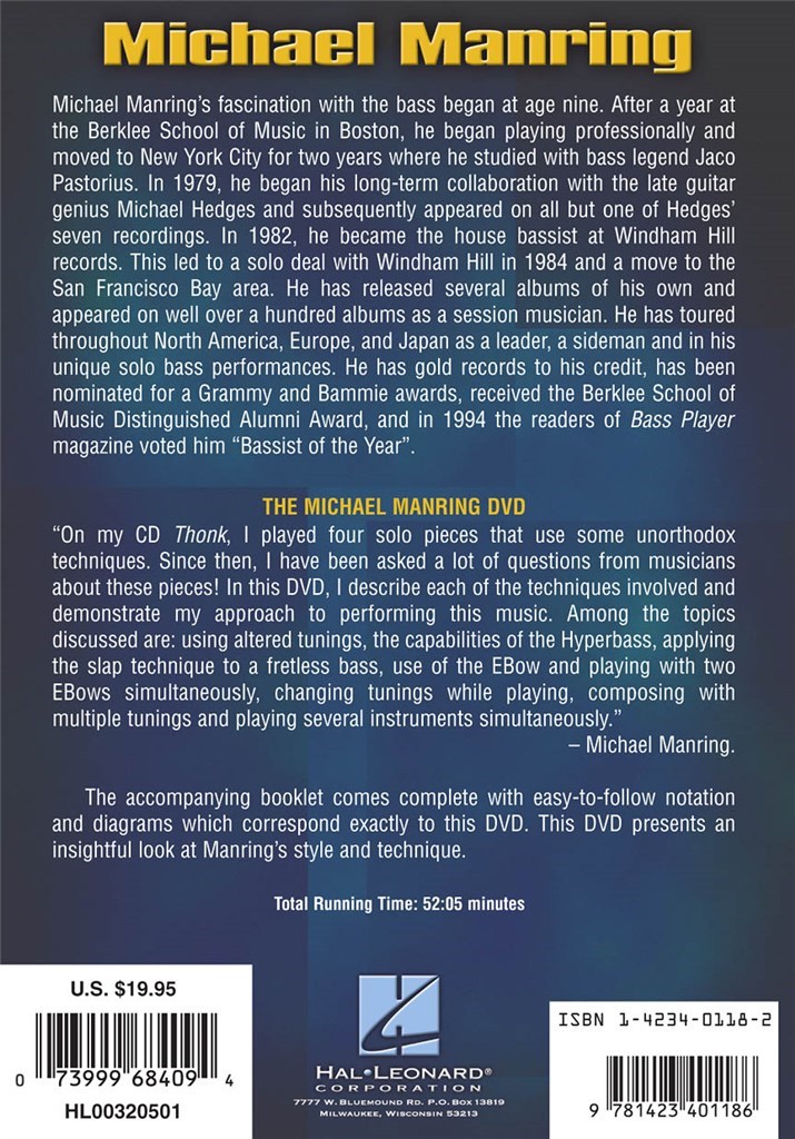 Dans ce DVD, Michael Manring joue 4 solos et utilise des techniques peu communes et vous explique comment les jouer. 52 min. En Anglais, avec livret.