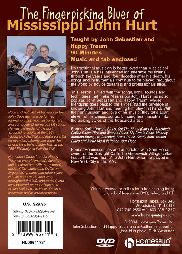 90 minutes pour apprendre le style de Mississippi John Hurt. Cette leçon se fait à travers les chansons qui l'ont rendu populaire : Spike Driver's Blues, Got The Blues, Coffee Blues, Richland Woman Blues, My Creole Belle, Monday Morning Blues, O'm Satisfied, Stack O'Lee, Candy Man, Avalon Blues, Make Me A Pallet On Your Floor.