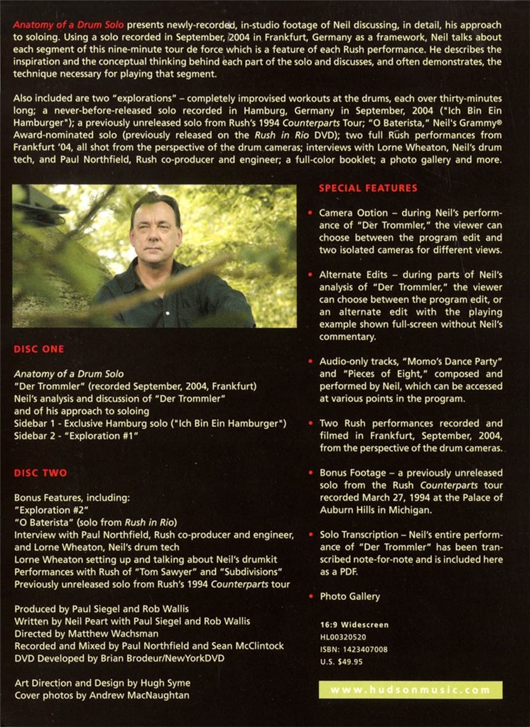 Anatomy Of A Drum Solo présente-enregistré en studio images de star de tambour célèbre Rush Neil Peart discutant de son approche de l'isolation. À l'aide d'un solo, enregistré en 2004 de Francfort en tant que cadre, Neil parle de chaque segment de cette neuf minutes tour de force qui est devenu un élément célèbre de l'expérience live de Rush. Techniques sont expliquées en détail, comme Peart vous guide à travers le processus de réflexion et d'inspirations qui se combinent pour former le solo. Sont également inclus deux " explorations " - complètement improvisés entraînements à la batterie, chacun plus de 30 minutes, un jamais-avant solo sorti enregistré en 2004 de Hambourg, un solo inédit de la tournée d'homologues de 1994, solo de Neil nominé aux Grammy et deux spectacles de Rush pleine de 2004, tous tournés dans la perspective de tambour-caméra. Cette remarquable collection d'images de la performance et des entrevues est saluée par une foule de caractéristiques spéciales de DVD incluant : caméra Option - au cours de la performance de Neil de Der Trommler, le spectateur...