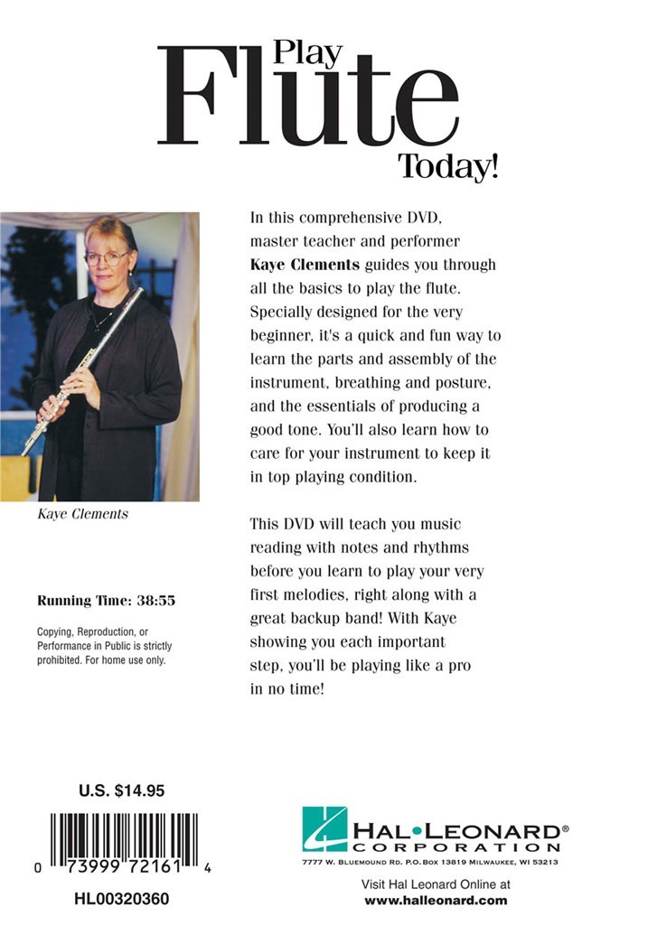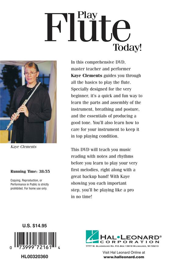 Dans ce DVD complet, maître enseignant et interprète Kaye Clements vous guide à travers toutes les bases pour jouer de la flûte. Spécialement conçus pour le débutant même c'est une façon rapide et amusante à apprendre les pièces et l'Assemblée de l'instrument, de respiration et posture et les éléments essentiels de produire un bon ton. Ce DVD peut également être utilisé comme un supplément à la jouer flûte aujourd'hui ! Niveau 1. Comprend : Assemblage et entretien production sonore musique lecture jouant des chansons avec une bande de sauvegarde apprendre à votre propre rythme et ouvre la porte au monde de la musique de Flute !