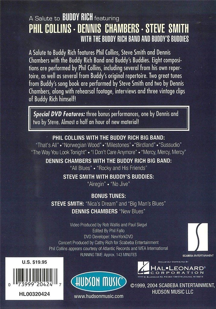 Le Buddy Rich Band accompagné de Phil Collins interprète 8 titres That's All, Norwegian Wood, Milestones, Birdland, Sussudio, The Way You Look Tonight, I Don't Care Anymore, Mercy Mercy Mercy, de Dennis Chambers 2 titres (All Blues et Rocky And His Friends) et de Steve Smith 2 titres (Airegin et No Jive). 105 minutes de plaisirs ou l'on retrouve un Phil Collins de très haut niveau. En anglais
