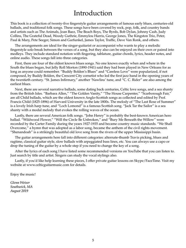 This is a collection of twenty-five solo fingerstyle guitar arrangements of famous early blues, centuries-old ballads, and traditional folk songs. If you want to learn how to play a melodic fingerstyle solo break between the verses of a song, then these arrangements are a great way to start. All songs include standard notation with fingering indications, tablature, guitar chords, lyrics, and online audio. Songs include: Barbara Allen · Frankie and Johnny · The House of the Rising Sun · John Henry · Loch Lomond · Scarborough Fair · and more. Audio is accessed online using the unique code inside the book and can be streamed or downloaded. The audio files include PLAYBACK+, a multi-functional audio player that allows you to slow down audio without changing pitch, set loop points, change keys, and pan left or right.