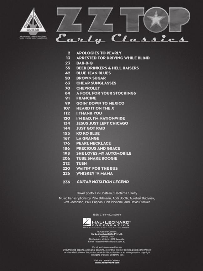 Part of the Guitar Recorded Versions series, this collection contains 25 songs from the early years of the classic American rock trio ZZ Top transcribed for Guitar.
