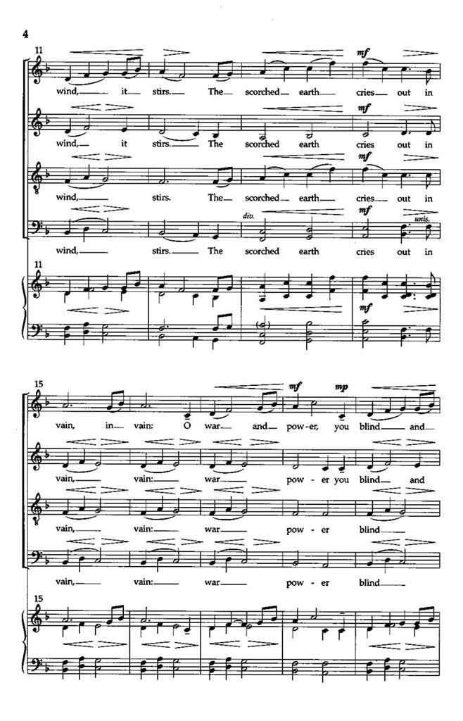 Principalement connu pour sa musique instrumentale fantastique, Frank Ticheli nous offre sa troisième œuvre chorale publiée. Pour le chœur mixte sans accompagnement, le texte du compositeur pouvait être utilisé dans plusieurs concerts — musique américaine, jour de la Terre, paix, etc.