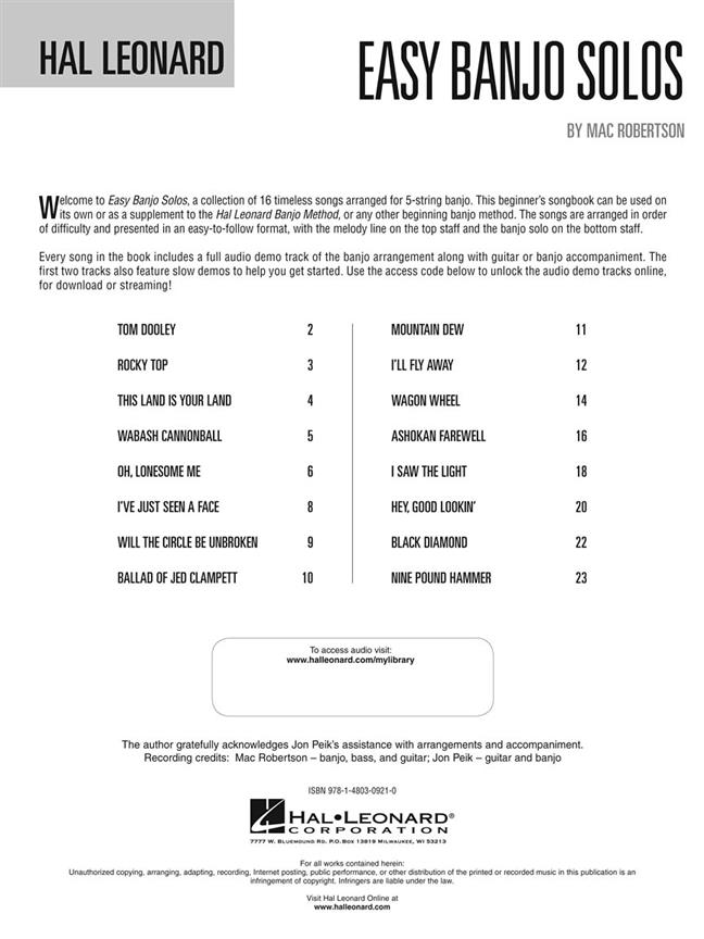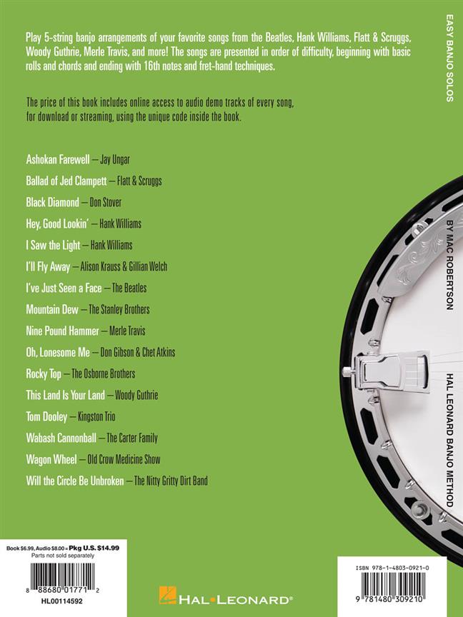 Easy Banjo Solos For 5-String Banjo contains arrangements for 16 well-known songs by artists such as The Beatles, Hank Williams, Flatt and Scruggs, Woody Guthrie, Merle Travis and more.