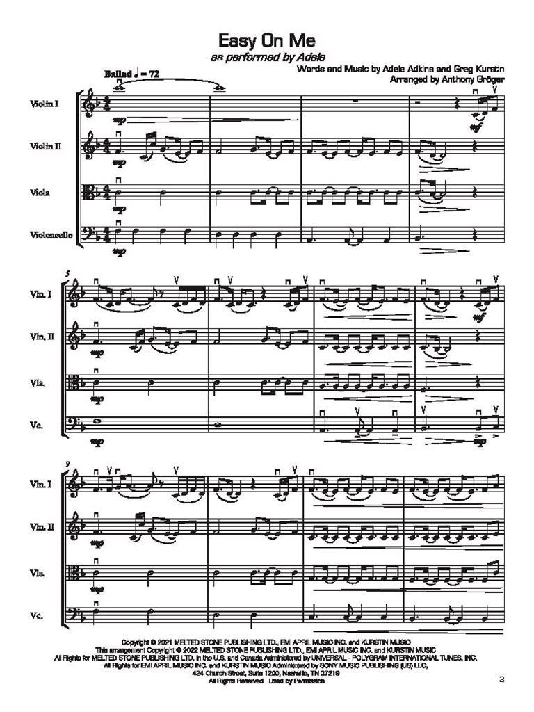 Avec Easy on Me, l’artiste britannique Adele a immédiatement conquis les hit-parades internationaux. Cette chanson – le premier single tiré de 30, son album très attendu – exprime les difficultés résultant d’un mariage brisé ; elle souhaitait particulièrement communiquer ses regrets et demander pardon à son fils. L’arrangeur Anthony Gröger, qui a tout de suite aimé la chanson, en a créé cet arrangement nostalgique et espressif pour quatuor à cordes.