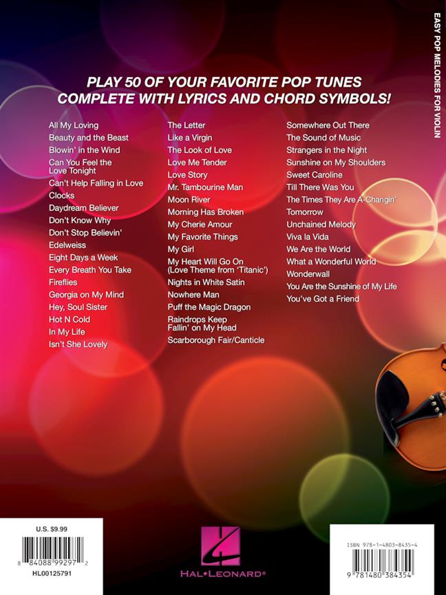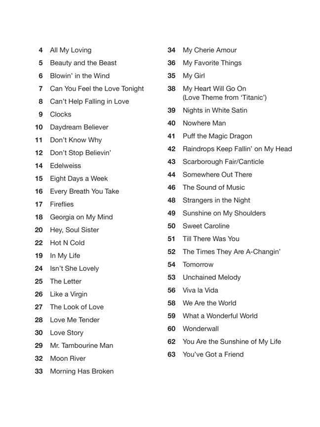 Jouez 50 de vos morceaux pop préférés sur l’instrument de votre choix ! Cette collection propose des arrangements écrits dans des tonalités et tessitures accessibles, avec des paroles et des symboles d’accords. Les chansons incluent : All My Loving · Soufflant dans le vent · Horloges · Ne cesse pas de croire · Chaque respiration que tu prends · Lucioles · Salut, Soul Sister · Dans ma vie · Histoire d’amour · My Girl · Nuits en satin blanc · Douce Caroline · Mélodie Libérée · Viva La Vida · Quel monde merveilleux · Tu as un ami · et plus encore.