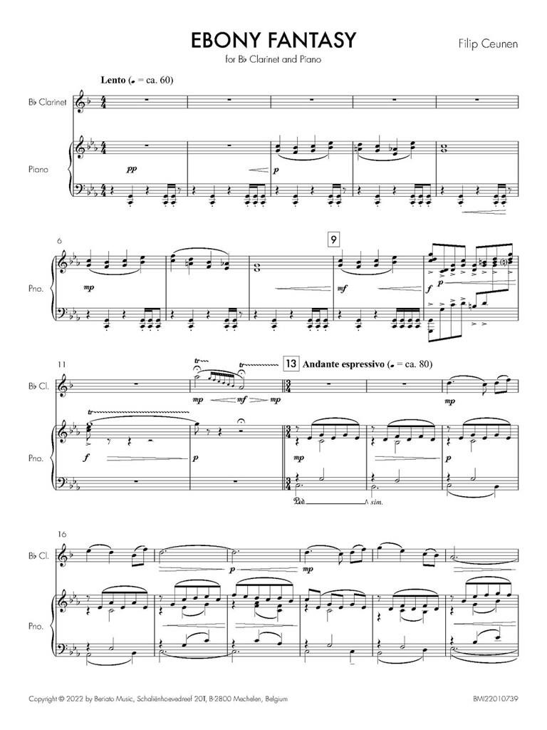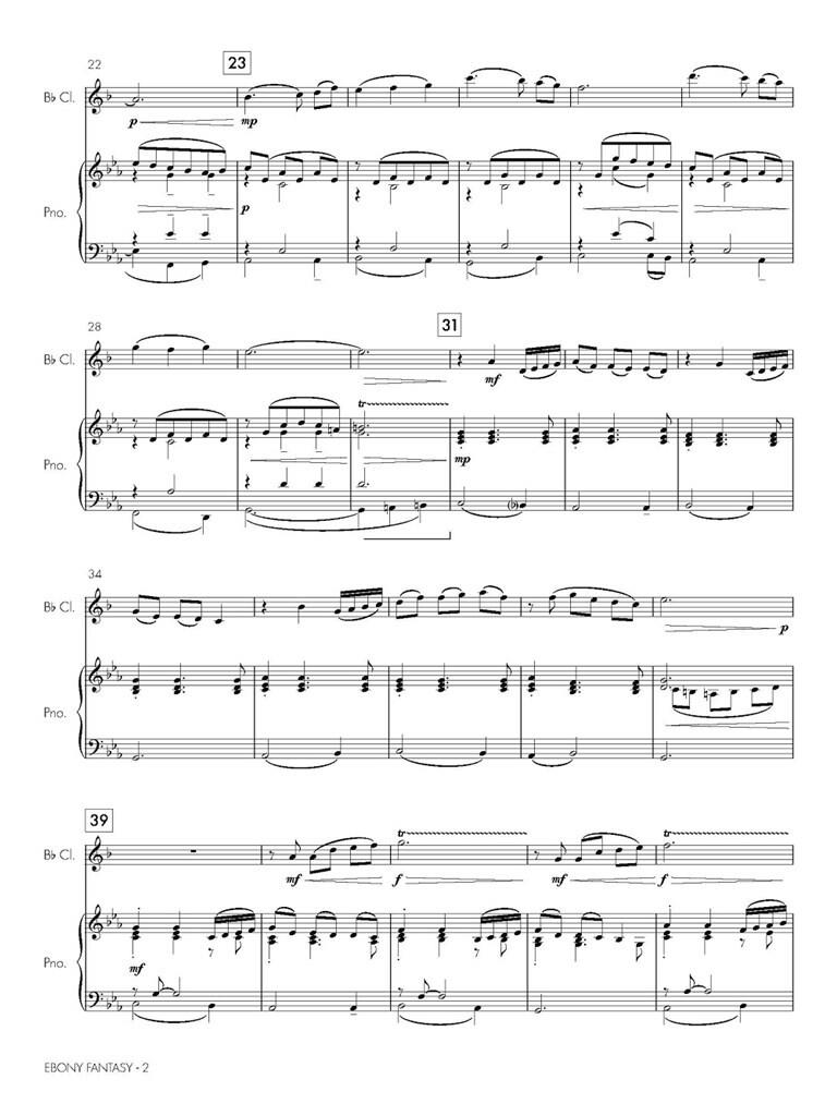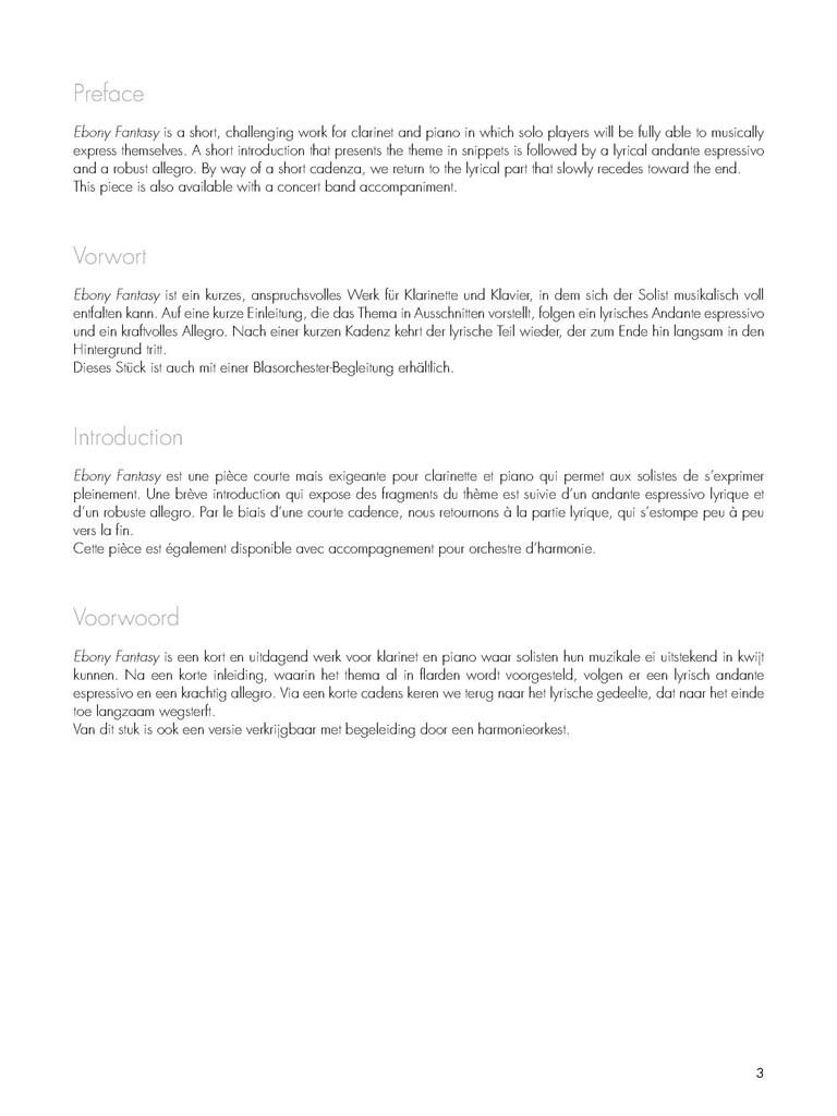 Ebony Fantasy est une pièce courte mais exigeante pour clarinette et piano qui permet aux solistes de s’exprimer pleinement. Une brève introduction qui expose des fragments du thème est suivie d’un andante espressivo lyrique et d’un robuste allegro. Par le biais d’une courte cadence, nous retournons à la partie lyrique, qui s’estompe peu à peu vers la fin. Cette pièce est également disponible avec accompagnement pour orchestre d’harmonie.