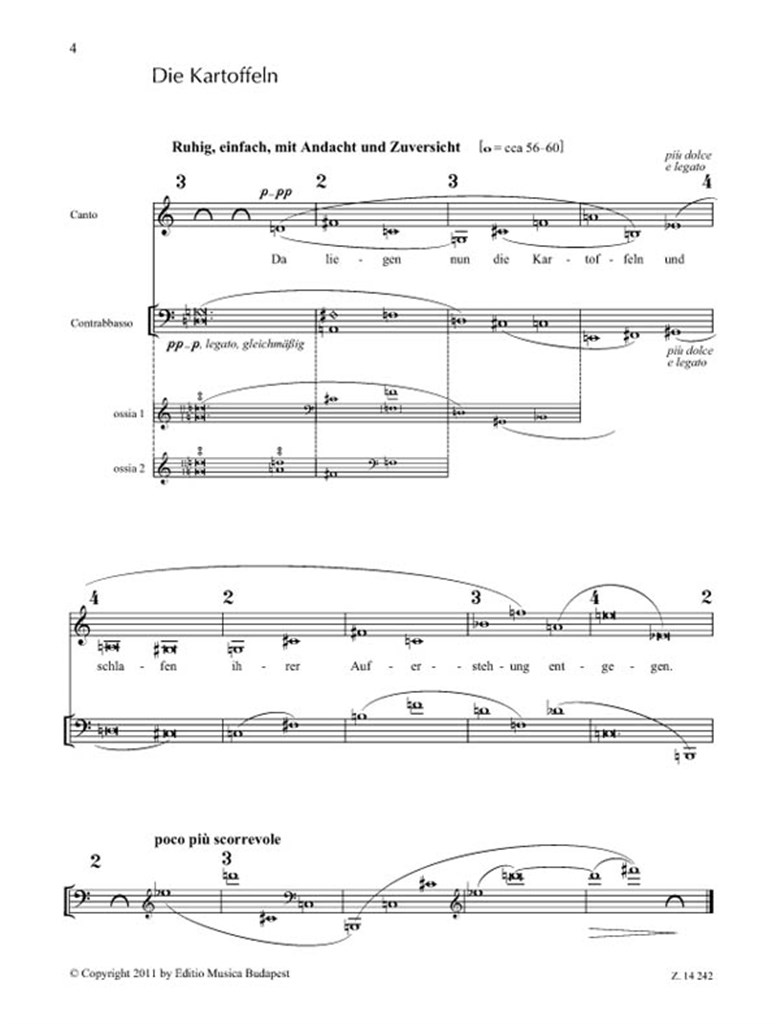 The work was composed in 1992 for the 85th birthday of Kurtág's teacher, Sándor Veress. The ensemble of instruments is unusual: two basset horns and two quarter-tone pianos (the well-known predecessor of the latter is Charles Ives' Three Quarter-Tone Pieces for two pianos). The special tuning in this case is not that the tonality moves in an ultra-chromatic direction, rather that it makes the contours more nebulous, somewhat incomprehensible and dreamlike, and especially that the two wind instruments align themselves with the normal pitch of the piano. In many respects the musical material links with Kurtág's other compositions, for example the familiar movements of the Games series, the colinda reflections and the second piece of Three Old Inscriptions (op. 25). The broad spanning and profusely ornamented cantilena of the two basset horns reflects the inspiration of folk music.