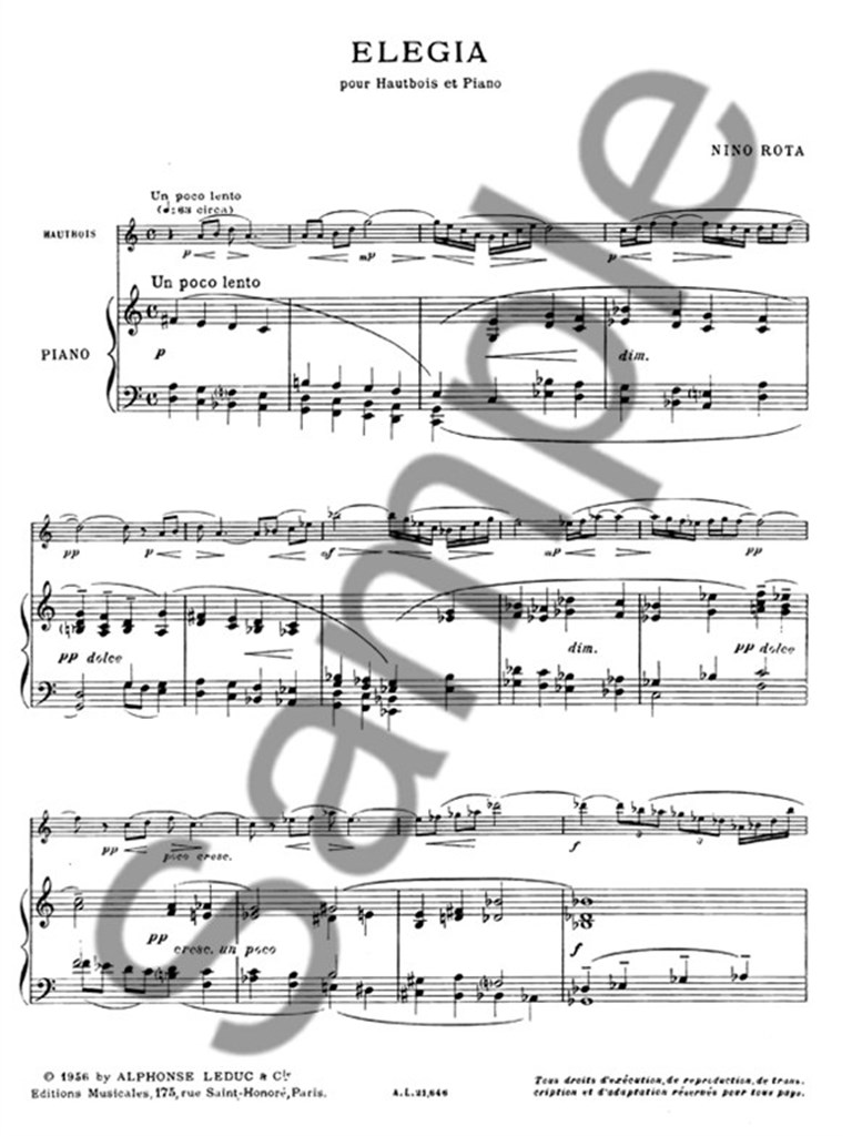 Elegia is a small piece for Oboe and Piano accompaniment by Nino Rota . Really lyrical, its medium difficulty will enable intermediate players to execute it, for a recital or for a contest. This lovely work is quite slow, nostalgic at some points and ends up on a perfect harmony between the two instruments. Nino Rota (1911-1979) is an Italian composer and conductor, particularly known for his works on film music. He also composed 5 ballets, 10 orchestras as well as numerous music chamber works, including a string concerto.