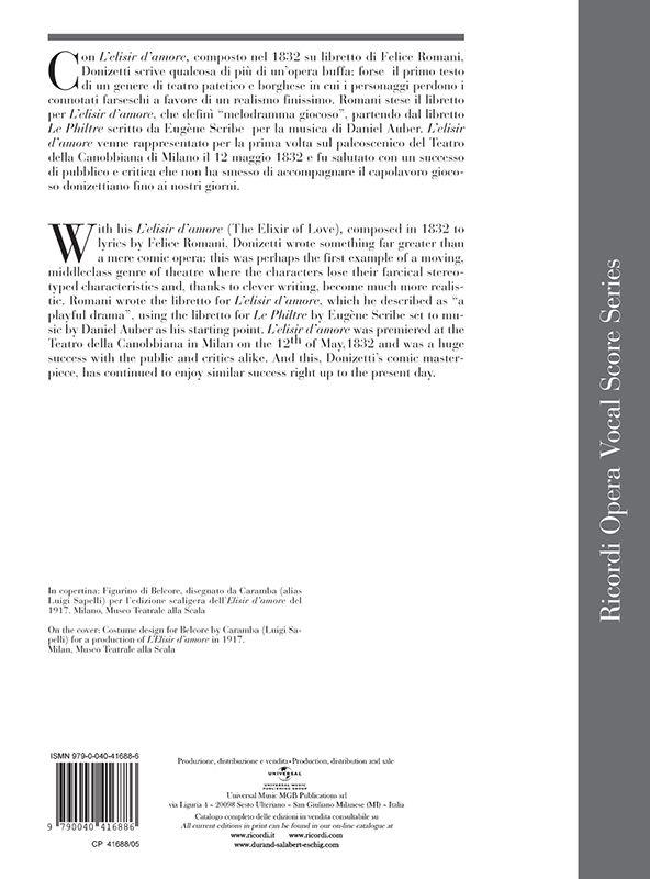 The vocal score for Donizetti's 1832 opera Elisir D'Amore in paperback edition.