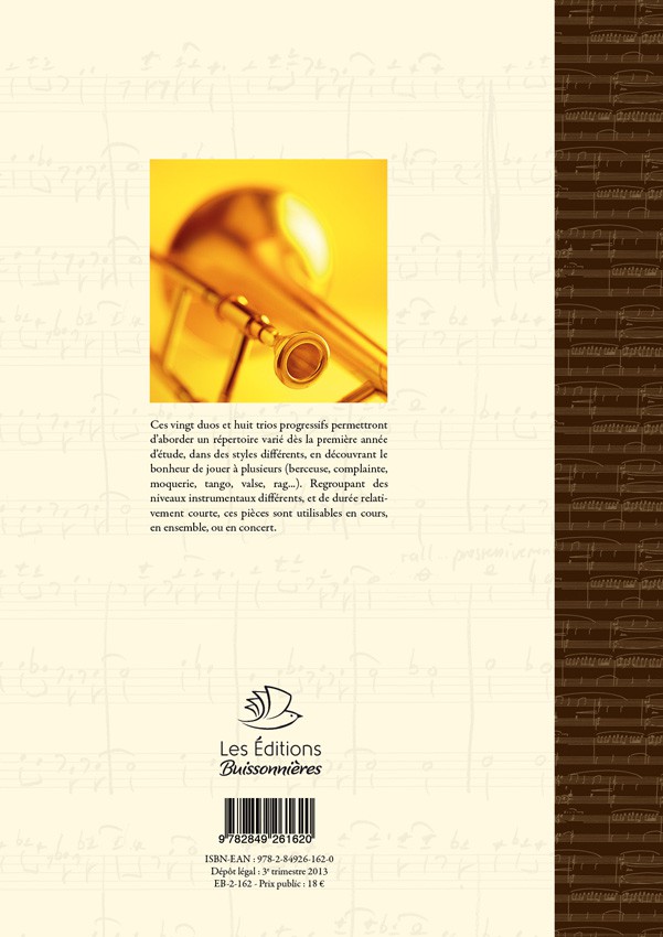 Ces vingt duos et huit trios progressifs permettront d’aborder un répertoire varié dès la première année d’étude, dans des styles différents, en découvrant le bonheur de jouer à plusieurs. Regroupant des niveaux instrumentaux différents, et de durée relativement courte, ces pièces sont utilisables en cours, en ensemble, ou en concert.