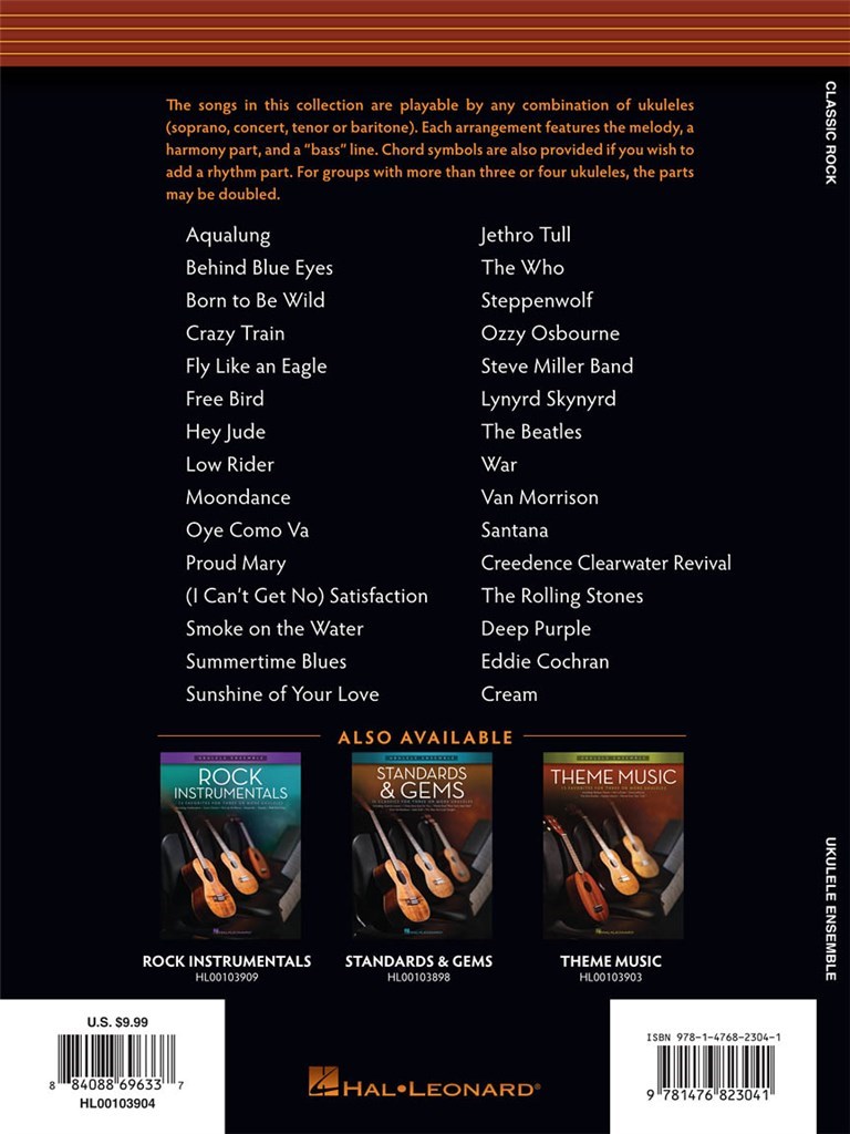 Pour les groupes de plus de trois ou quatre ukulélés, les parties peuvent être doublées. Ce volume comprend 15 grandes chansons de rock classique, y compris Aqualung, Born to Be Wild, Hey Jude, Proud Mary, (je ne peux pas Get No) Satisfaction et beaucoup plus.