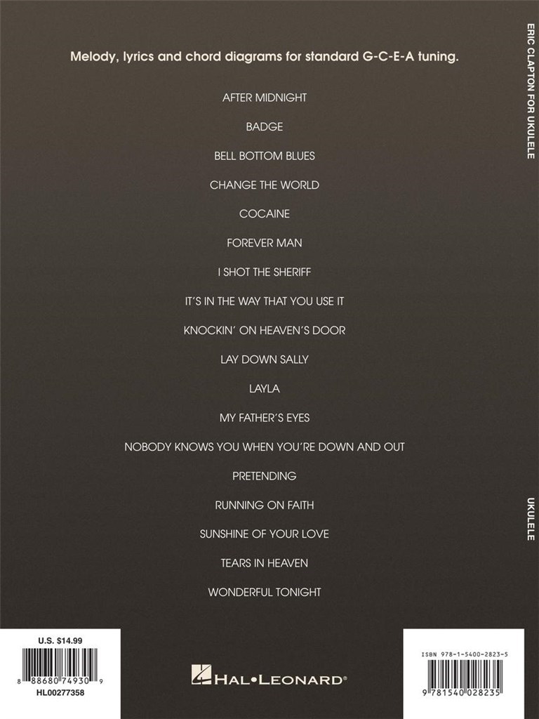 18 songs from Slow Hand presented in arrangements with melody, lyrics & chord diagrams for standard G-C-E-A tuning. Includes: Badge - Change the World - Cocaine - I Shot the Sheriff - Lay down Sally - Layla - My Father's Eyes - Sunshine of Your Love - Tears in Heaven - Wonderful Tonight - and more.