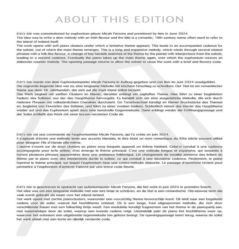 Erin's Isle est une commande de l'euphoniumiste Micah Parsons, qui l'a créée en juin 2024.