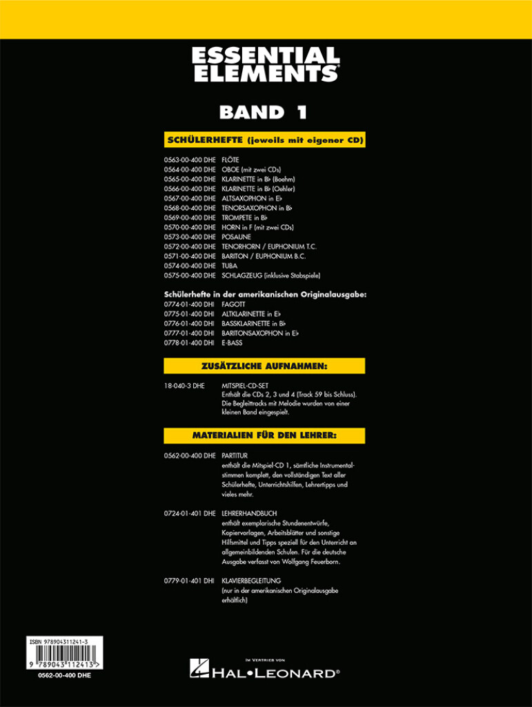 Apprendre un instrument en cours est une méthode éprouvée aux États-Unis depuis des années et devient de plus en plus populaire en Allemagne. Essential Elements offre non seulement une formation de base et complète pour tous les instruments à vent et percussions de l’orchestre à vent et leur interaction, mais promet aussi beaucoup de plaisir à apprendre et à faire de la musique ensemble. En plus de la théorie musicale, enseignée de manière sensée et par petits pas, il existe aussi des incursions intéressantes dans la théorie musicale, l’histoire et la culture. Chaque livret d’élève est accompagné d’un CD d’audition et de jeu en parallèle, enregistré par des musiciens professionnels. De plus, il existe un coffret de CD Mitspiel, qui peut être utilisé pour s’entraîner à la maison depuis environ le milieu du carnet de l’élève respectif. Ce travail n’est pas seulement idéal pour apprendre un instrument en classe. Il peut être utilisé de manière excellente dans les orchestres pré- et débutants des orchestres à vent. Ce qui a été appris en cours individuels ou collectifs est répété avec Essential Elements et, en même temps, de nombreux arrangements orchestraux sont disponibles, afin que l’interaction puisse être pratiquée dès un stade précoce.
