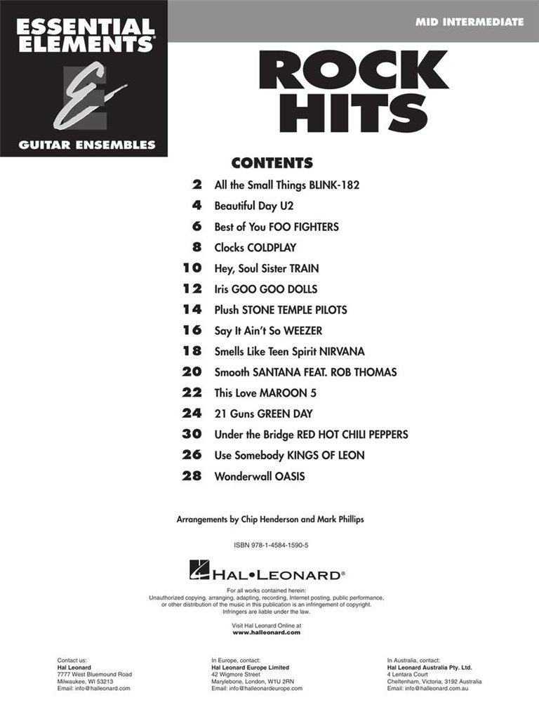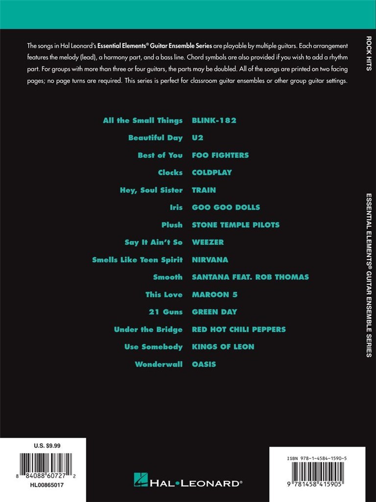 The songs in the Hal Leonard Essential Elements Guitar Ensemble series are playable by multiple guitars. Each arrangement features the melody (lead), a harmony part, and a bass line. Chord symbols are also provided if you wish to add a rhythm part. For groups with more than three or four guitars, the parts may be doubled. All of the songs are printed on two facing pages - no page turns are required. This series is perfect for classroom guitar ensembles or other group guitar settings. This edition features 15 rock hits: All the Small Things - Beautiful Day - Best of You - Clocks - Hey, Soul Sister - Iris - Plush - Say It Ain't So - Smells like Teen Spirit - Smooth - This Love - 21 Guns - Under the Bridge - Use Somebody - Wonderwall.