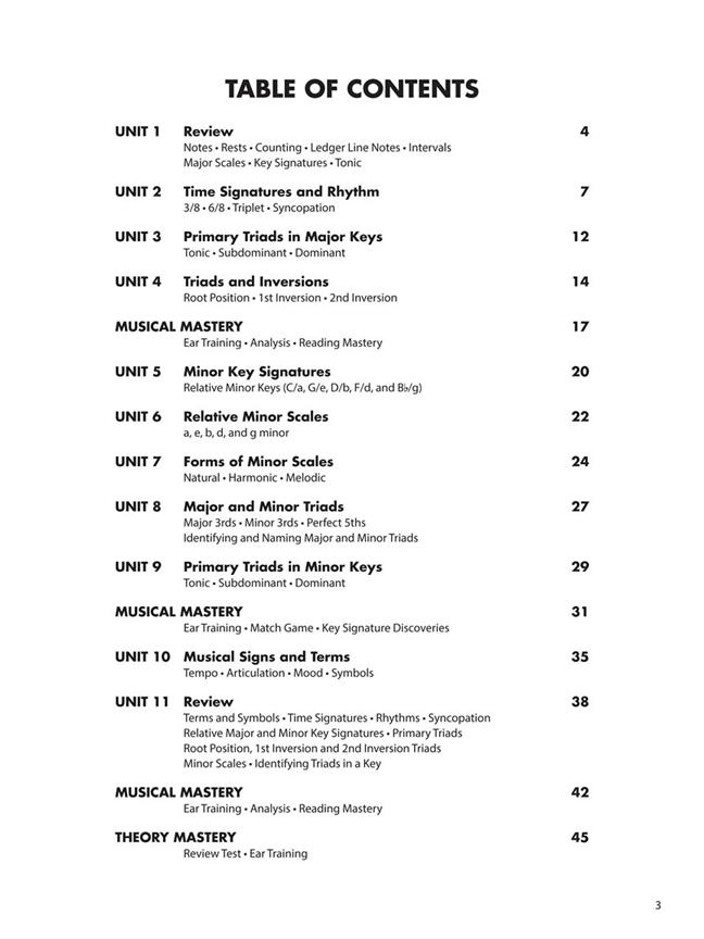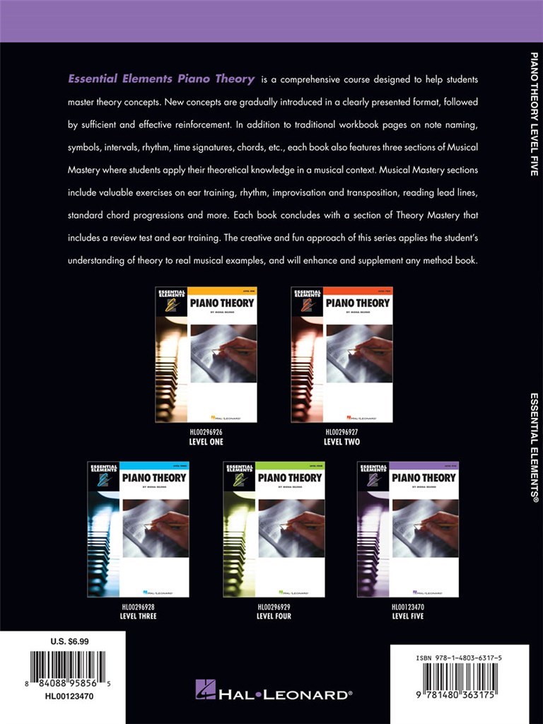 Éléments essentiels : Théorie du piano est un cours complet conçu pour aider les étudiants à maîtriser les concepts théoriques. De nouveaux concepts sont progressivement introduits dans un format clairement présenté, suivis d’un renforcement suffisant et efficace. Chaque livre comprend trois sections de Maîtrise musicale : l’entraînement auditif, la maîtrise du rythme, des symboles, la lecture et l’analyse. Les élèves apprennent à appliquer leurs connaissances théoriques dans un contexte musical à travers des éléments tels que l’improvisation, la transposition, la lecture des lignes principales et des progressions d’accords standards. Chaque livre se termine par une section de Maîtrise de la Théorie qui comprend un test de révision et un entraînement auditif. L’approche créative et ludique de cette série applique la compréhension théorique de l’élève à de vrais exemples musicaux, et enrichira et complétera tout manuel méthode.