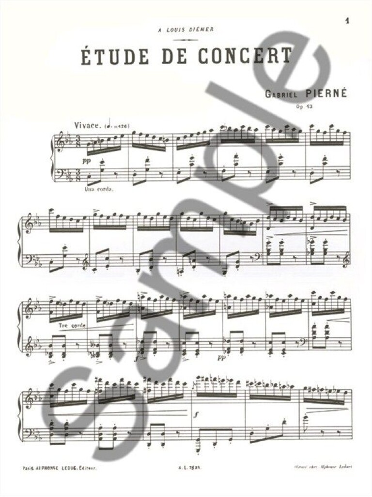 Etude De Concert, Op. 13 is a brilliant piece for Piano by Gabriel Pierne. Quite challenging, it highlights some virtuoso techniques and the tempo indicated seems really fast. An advanced level or above would be required to perform the piece as written. Etude De Concert, Op. 13 would be the perfect addition for a concert as mainly classical yet modern on some aspects and well balanced. Gabriel Pierne is a French composer and conductor, who mainly wrote some chamber music and some lyrical symphonies.