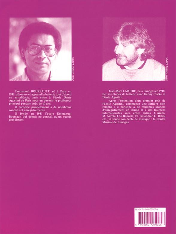 Etude Progressive de Batterie is a very progressive method in two books written by Emmanuel Boursault (born in 1949) and Jean-Marc Lajudie (born in 1948), winner of the first prize of the Agostini School and founder of the Centre Musical of Limoges. This second book contains the third volume which includes many annotations and illustrations to help the development of the student. It introduces the players to all necessary bases to acquire some strong technique: ternary rhythm, tempo, sonority, theory and jazz basics. This method will develop the skills of all beginner drummers.