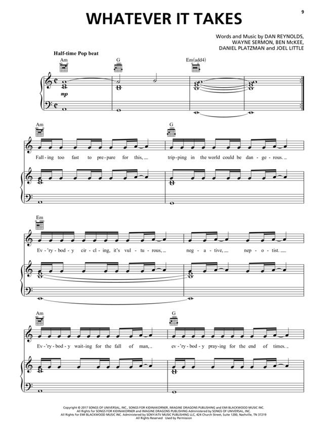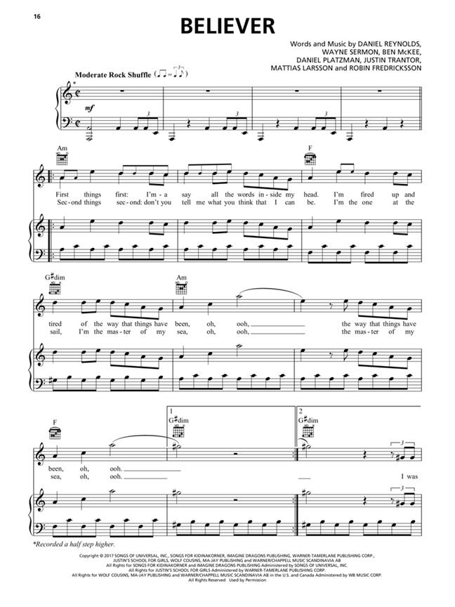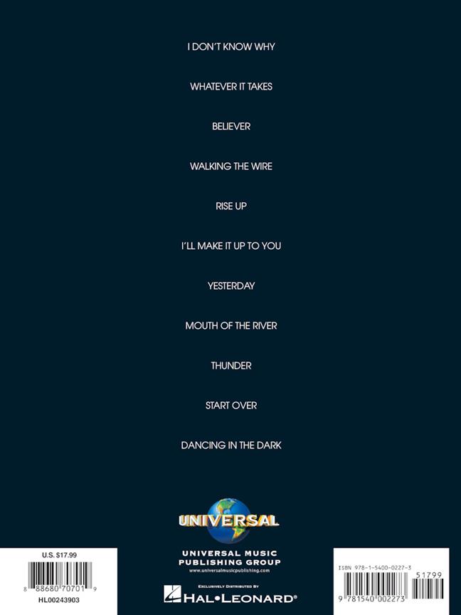 Ce troisième album studio du groupe de rock du Nevada Imagine Dragons est sorti à l’été 2017 et a atteint la #2 du classement des albums Billboard® 200. Notre portfolio assorti comprend des arrangements pour piano, chant et guitare des singles « Believer » et « Thunder » ainsi que 9 autres chansons : Dancing in the Dark - I Don’t Know Why - I’ll Make it it to You - Mouth of the River - Rise Up - Start Over - Walking the Wire - Whatever It Takes - Yesterday.
